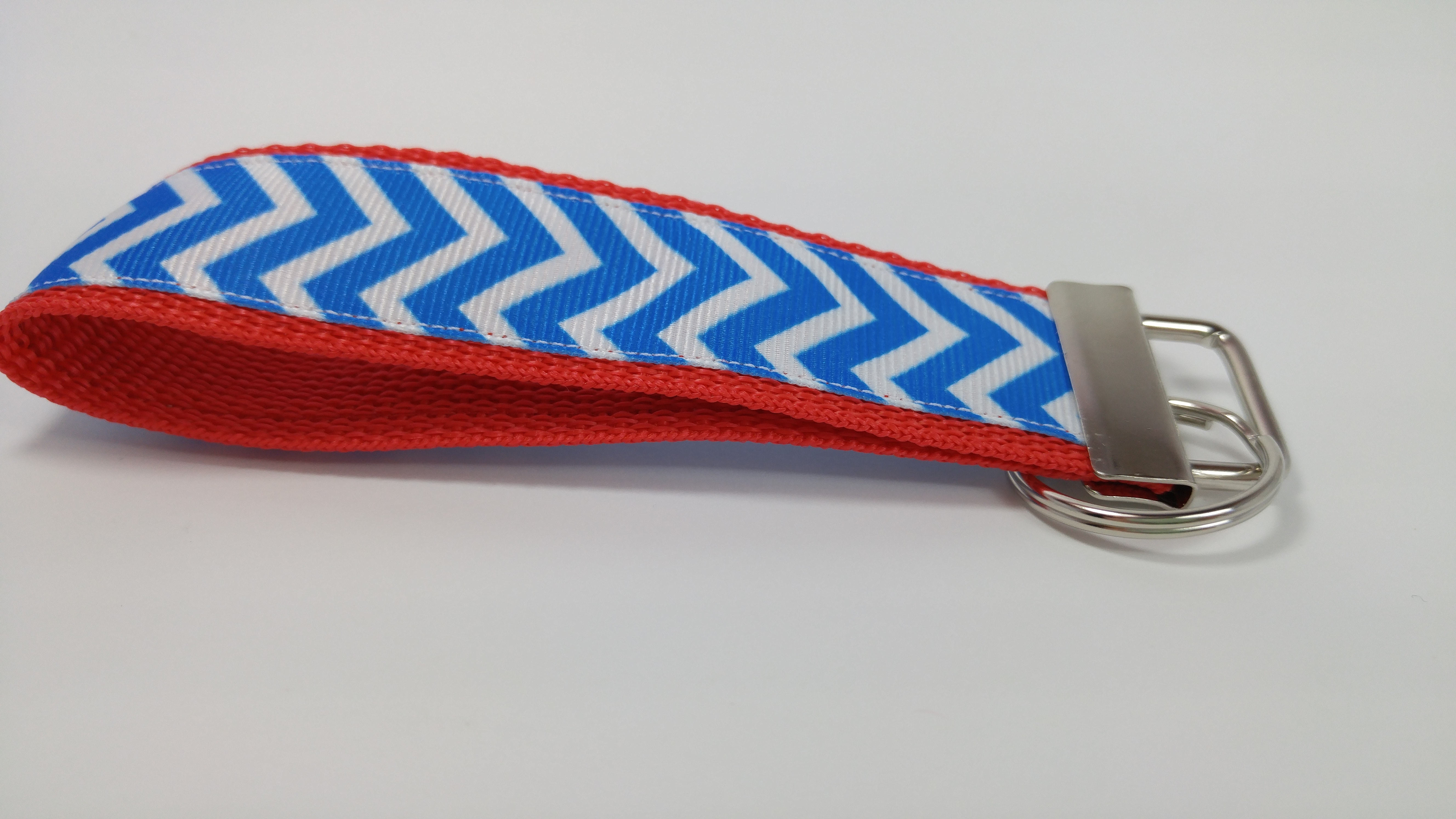 Colors: Blue and white chevron Webbing: Red Hardware: nickel plated