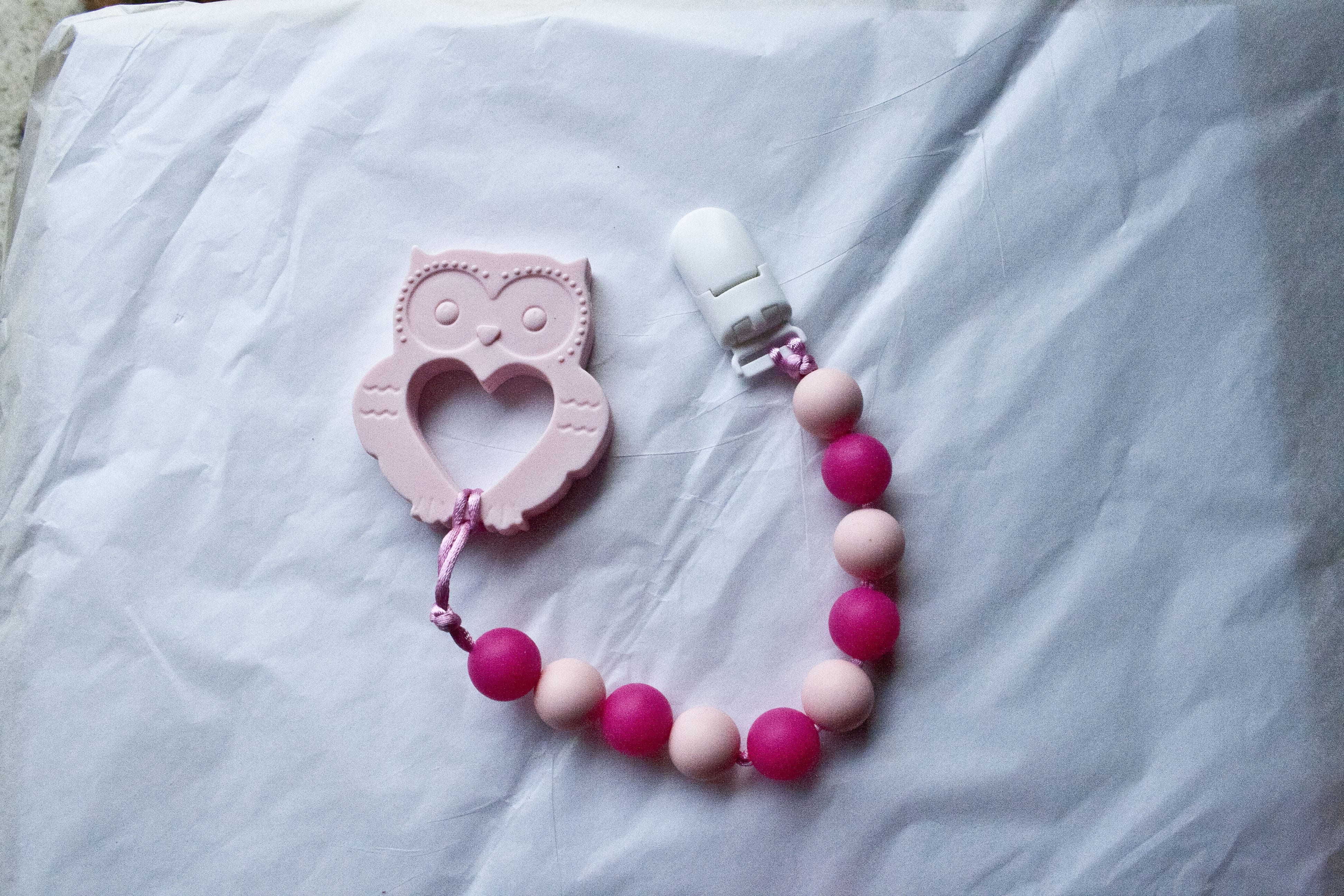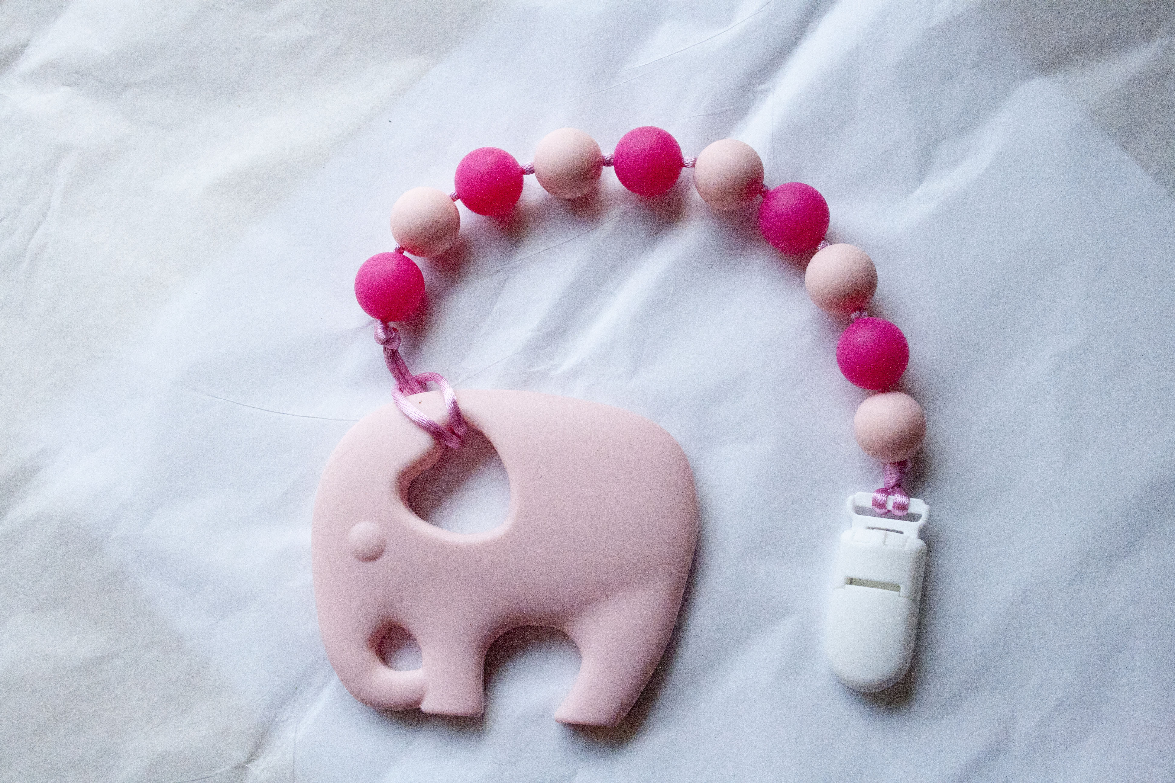 These Pacifier Teething Clips are made with kitchen safe silicone. They are safe for teething and are great for pacifies.